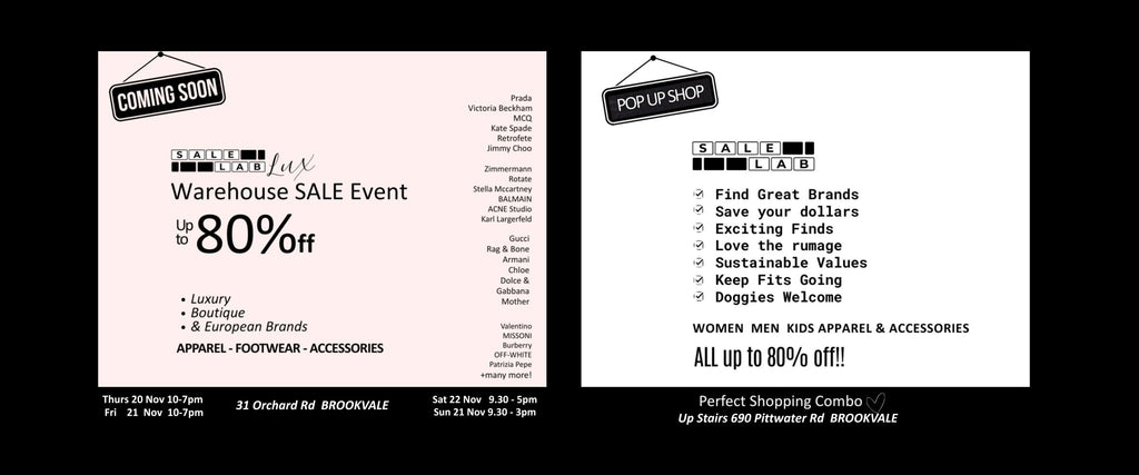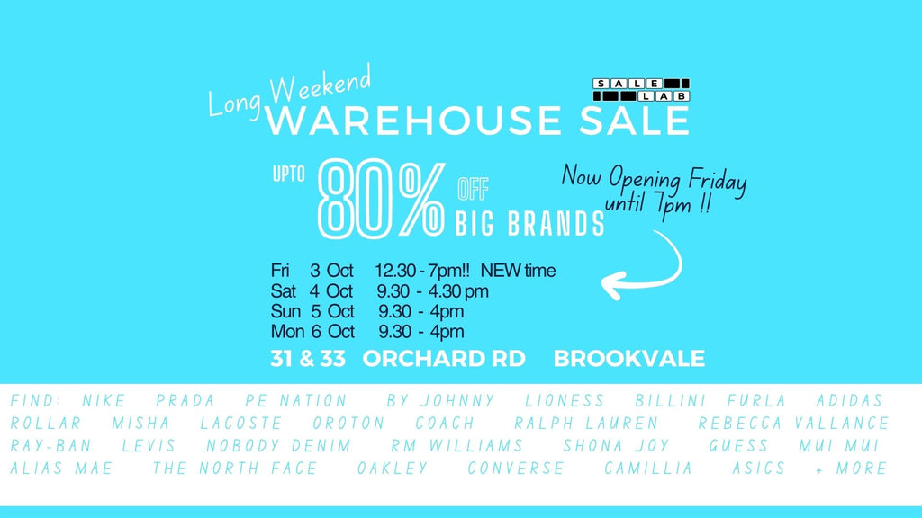 Our Sydney stores are bursting with incredible bargains up to 70% to 80% off retail. We embrace our Salelab community and aim to bring friendly, high street shopping vibes. Plus, dogs are welcome! Keep an eye out for our BIG WAREHOUSE EVENTS to score even bigger savings.